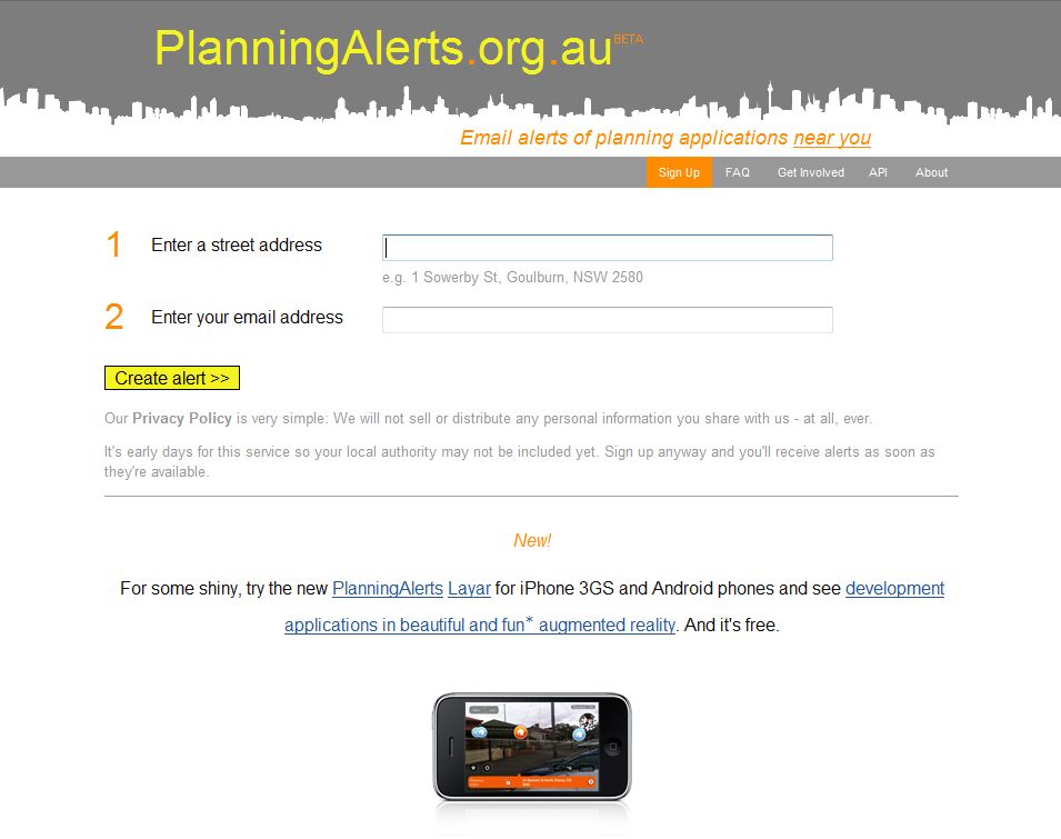 The app is an extension of OpenAustralia’s already-successful web-based planning alerts service. This allows users log the address of a property and be informed by email of development proposals within either a 200 metre, 800 metre or 2km radius, assuming the property is located within the boundaries of a council that provides this information online in a format that has been scraped by the software.