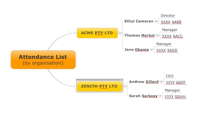 This shows the attendees grouped by their organisation. Of course you could use the same trick to group them by position, or to produce a map of a catalogue grouped by product type, shelf location, etc.