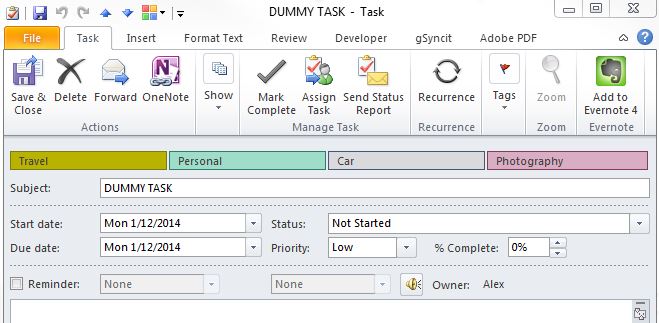 - Set up a dummy task in Outlook as a basis for assigning categories and category colours. In Outlook create a dummy task with an obvious name and a date that’s well outside the likely date range of your actual project tasks. The purpose of this dummy task is to act as a transport so that the categories can be imported into each MM project planning map from Outlook. Then click on the categorise button under the Home tab on the ribbon and add your list of categories, assigning colours to them as you go. The resulting list of category tags should contain all the categories you want to use across all your maps. How to approach categorisation is up to you, but for the rest of this guide I’ll assume you are setting up categories and colours based on projects or sub-projects.