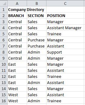 - If the table is in Word, copy and paste it to Excel (the opposite of of option 1). Then arrange the columns in descending hierarchical order, left to right. In this example the highest level is branch, followed by section. Then sort the rows in the same heirarchical order.
