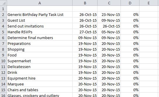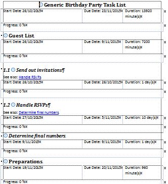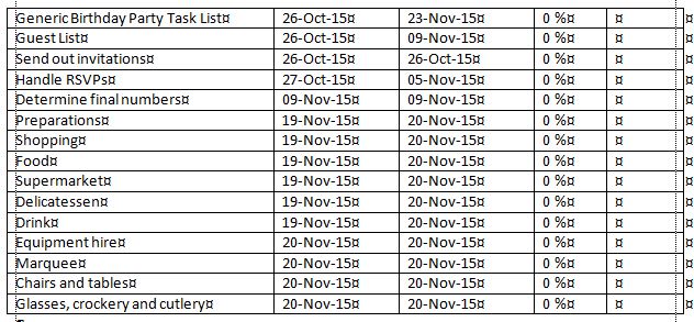 Again it may be possible to turn this into a simple list but this seems to require even more work than converting the Excel file, so I started to look at alternatives. My first point of call was the Outline view, but this does not include any task information. There is however another starting point, which already looks very much like the task list I want; the summary table of tasks and task information in the Gantt view, as shown in this snip of the Gantt chart from the party planning map: