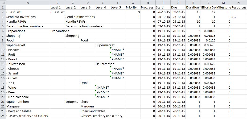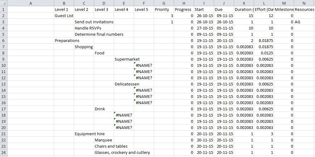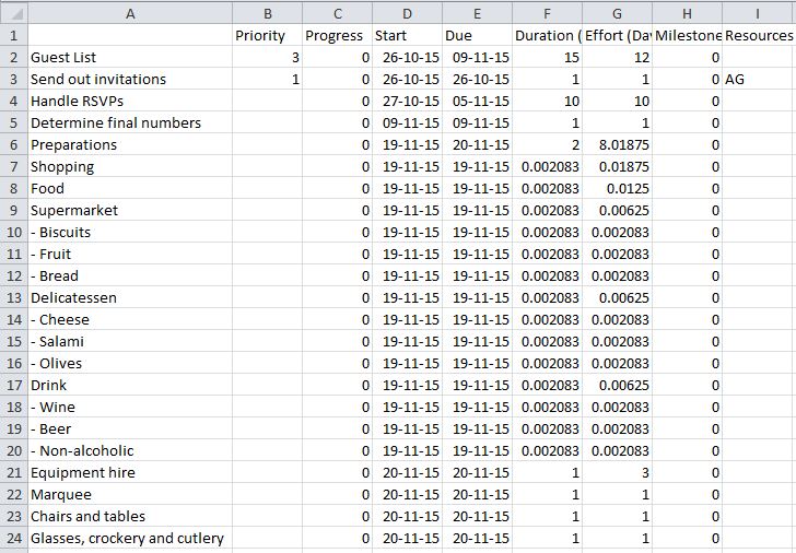 2. Open the file in Excel and insert a column to the left of the exported table. If you have list items in the Gantt table which are preceded by a dash or other mathematical symbol format the column you have just inserted in the Excel spreadsheet as text (it’s probably wise to save the file at this point). The spreadsheet should look something like this: