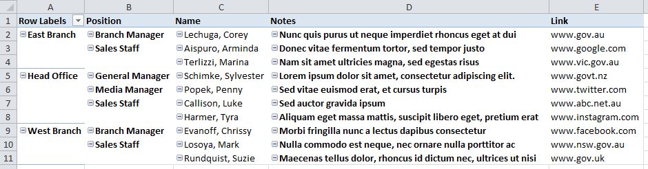 Obviously these tables are going to be more of a challenge. As an example I’ve taken the same hypothetical table I used earlier but changed the column order so that the Branch and Position columns come first. These and the Name columns are also sorted in alphabetical order so that the entries are grouped: