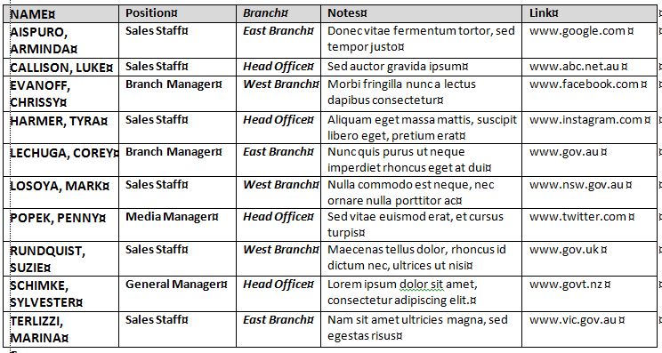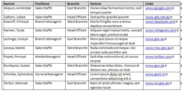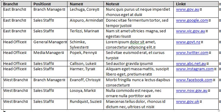 I’ve set up the following hypothetical table for the staff of an equally hypothetical company, sorted by the names of the mythical employees. The other fields are the staff positions, their branches, notes for each employee and a hyperlink (for these I’ve used actual websites but the techniques work equally well with email links):