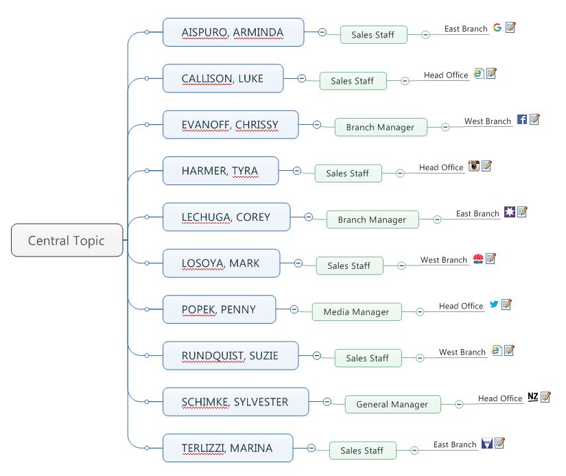 1. Simple “flat” table with ungrouped rows: Effectively this is an ungrouped simple list such as, for example, a list of attendees at a function or an organisation membership, typically with the person’s name in the first column. The resulting maps are comparatively flat; the first column forms the main topics, each with only one branch containing a cascading set of subtopics representing the other information. Additional material may be contained in the topic notes.