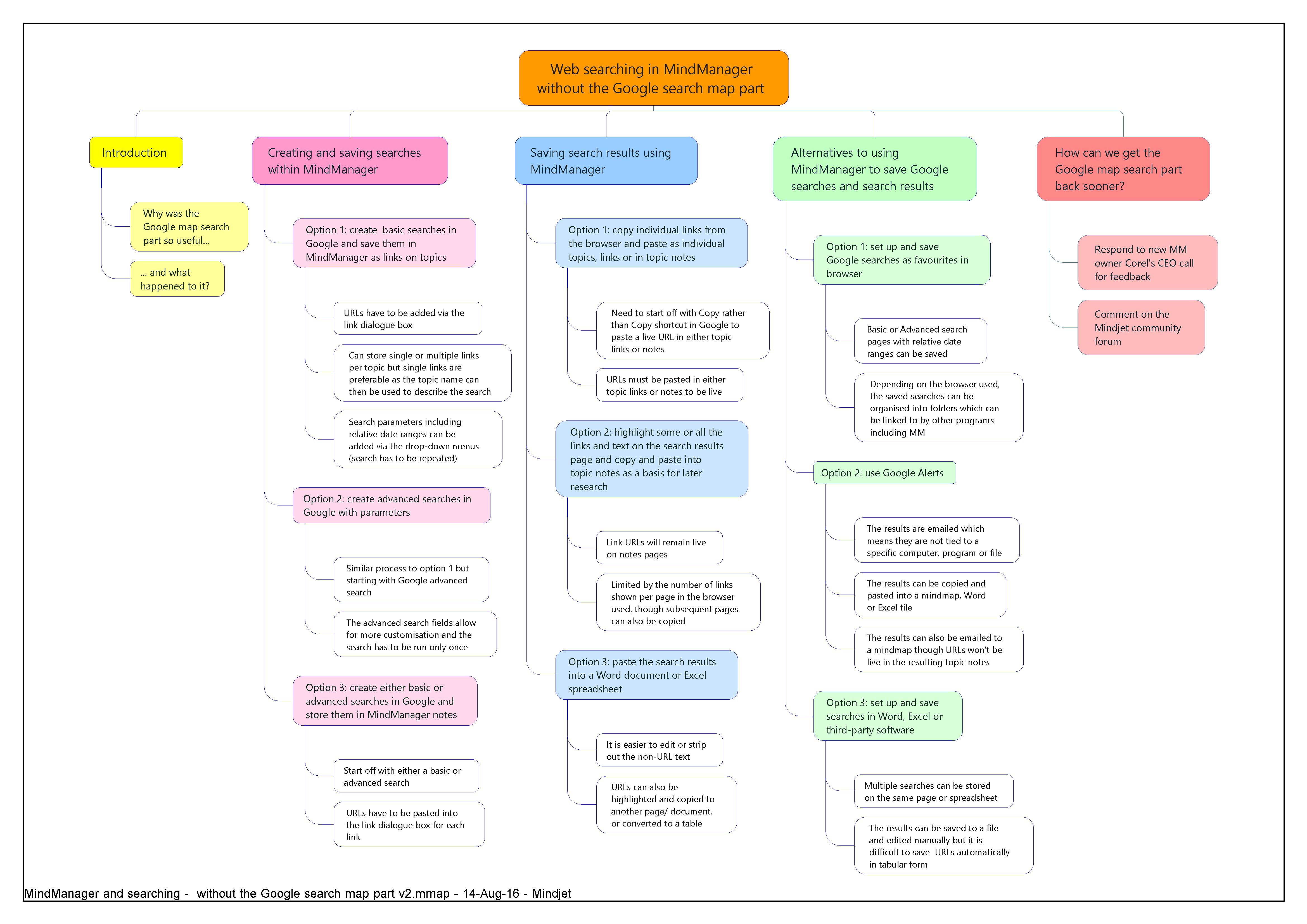 There may however be a small opportunity to change this. MindManager has just been purchased by Corel whose CEO Patrick Nichols has called for ideas on how to improve the product. I urge interested users to take up that offer by offering feedback on Nichol’s article and also on the Mindjet community forum about the importance and usefulness of the humble Google search map part and calling for it to be reinstated as soon as possible.