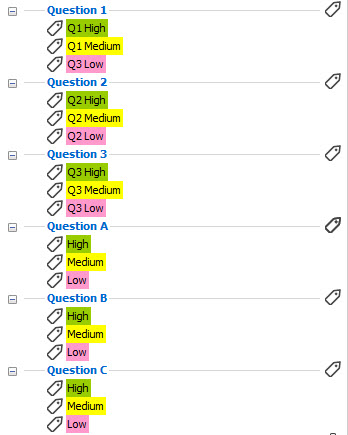 The advent of reusable tags in MM 2017 has now removed this arcane restriction. You can now reuse the same set of tags with multiple questions, for example (as noted in the MM 2017 help file quoted earlier) “High”, “Medium” and “Low. This makes life a lot easier, especially if you have a large number of questions with the same answer sets.