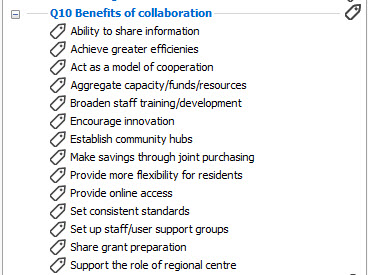 These tags can be used to explore broad trends – for example, it would be interesting if all the respondents in rural areas identified one group of benefits while city-based ones selected another. The main benefit however is the ability when you are writing up the research to use a tag group like this either by itself or in conjunction with the power filter to group the components of the responses relating to specific benefits. This process of filtering and grouping can help develop new insights regarding the survey material.
