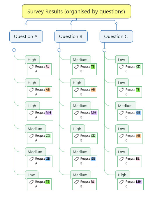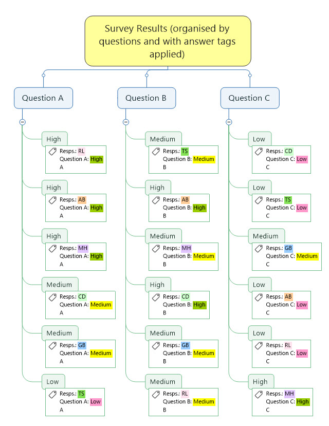 Obviously you have to be careful in using these results, especially if you are tagging based on your interpretations of complex answers rather than using tags simply to count the responses to multiple-choice questions (though if you are mainly doing the latter a spreadsheet rather than a mind map may be a more appropriate tool). You also need to decide (especially for multiple-choice questions) if more than one answer is permitted or if the responses – and the tags – will be mutually exclusive. The latter is more appropriate if you are going to look at proportions of the total number of responses for each question.