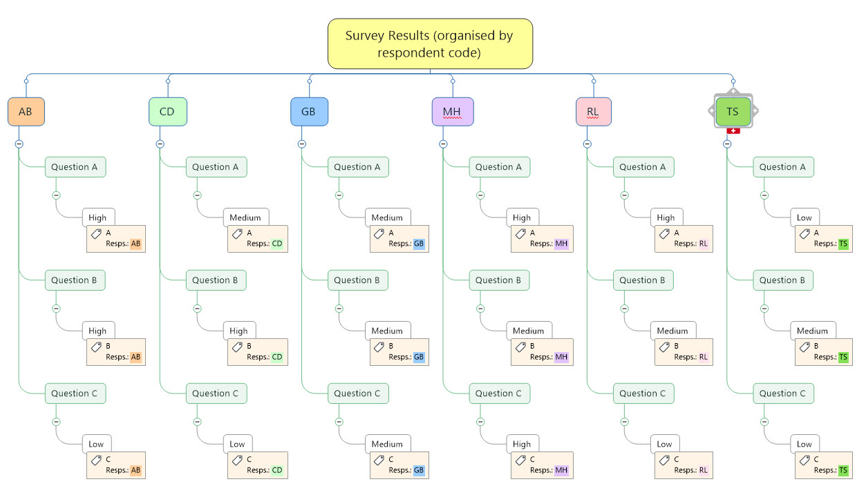 - Create a tag group in the Map Index of the map with a unique tag for each respondent name/code, then apply the relevant tag to all the sub-topics containing each respondent’s answers.