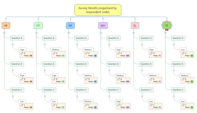 In the previous post I described my preferred methodology, which relies on creating a mind map in developing the survey or interview process and writing the individual questions. The responses can then be integrated directly into the map, moving from question to question and if necessary moving around to different parts of the map if respondents provide answers to a question which contain material relevant to other questions.