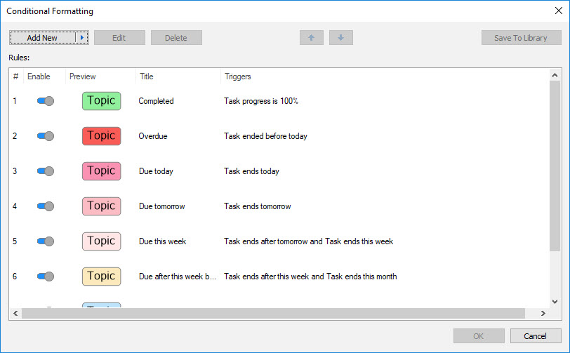 Essentially, Conditional Formatting gives users another way to view the information in their maps. For example, you can see easily which tasks are due next week – or the week after that – without having to filter the map. You can also set up rules to highlight topics containing specific company names, or tags representing certain products, and even combine the two. Conditional formatting can also be switched off to reveal the topic’s original appearance, but only topic-by-topic (multiple topics can be selected to do this, however).
