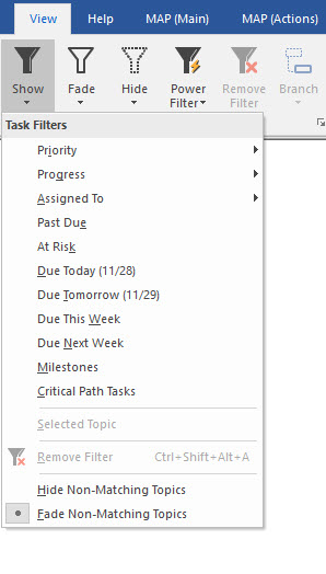 However, I’m still getting used to how SmartFade works. In MM2018 there is a new Filter – Fade icon on the Status Bar and a similar Fade button on the Filter tab on in the View ribbon. These show only task-related filtering, like the “Show” button (more on that in a moment). Furthermore, use either of these options and you will most likely fade out the topics you are filtering for. This may be your aim but I suspect that most people want to do the opposite – to fade out all the topics other than the ones they are filtering for.