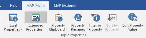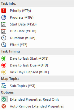 One of MAP’s many functions is Extended Properties. Found in the Topic Properties tab, the Extended Properties command allows users to copy task information into topic properties. This includes all the standard task info properties like priority, Start date, Due date etc, but also calculated ones like Days to Task Start, Days to Task Due and Task Days Elapsed. Once these properties are created they remain in sync with the task information and timing.