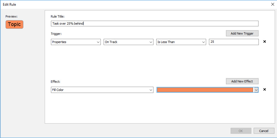 - One or more Effects (i.e., what will change in relation to the topic’s appearance if it meets the criteria). There is a wide range of topic attributes to choose from and in my example I have selected fill colour and where the task is more than 25% behind schedule I have also made the topic title bold (note: the bold effect is only available in MM version 2018.1.154 and higher).