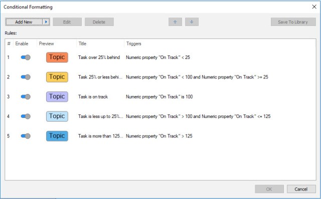 After creating and testing the calculated topic properties and the associated formulas the next step is to set up some rules in Conditional Formatting to highlight each state.