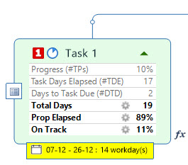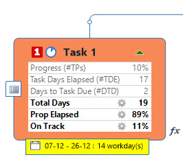 Note: In the original version of this article I was attempting to compare Task Days Elapsed to Duration but unfortunately these are counted differently – Duration in MindManager is based on counting workdays only whereas all the MAP extended properties are based on counts of all days. The two are directly comparable only if every day is a workday and there are no holidays. In this version On Track status is therefore based entirely on calculations using the MAP extended properties’ counts of all days – not as accurate as performing the calculations on workdays only, but still a useful measure.