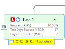 After you have created the formula test the topic with a variety of options for progress and duration. Remember that duration is locked to the start and due dates. Also, the MAP add-in assumes that the Task Days Elapsed topic property is “live” only if the task is current (i.e., the due date is after the current date).