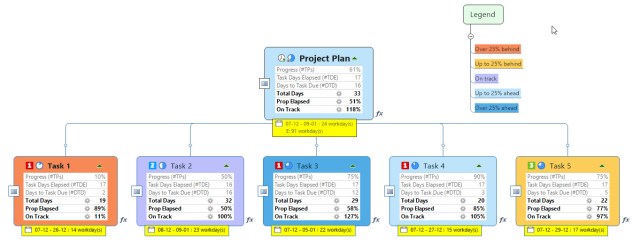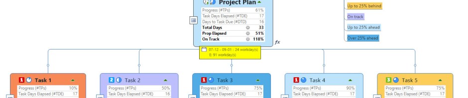 I was prompted to write this article by a query on the Mindjet Community Forum about whether it was possible in MindManager to highlight which tasks in a project are “On Track” – in other words, those tasks in which the proportion of each task completed matches the time elapsed since the task began.