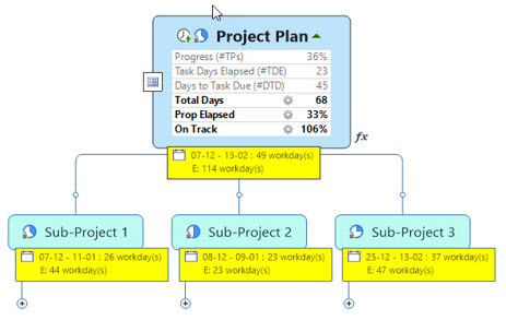 It is possible to reference the properties of other topics in a topic using a calculated property containing a formula which selects a topic range and applies an appropriate built-in function. Topic ranges are expressed relative to the position of the topic in the map hierarchy – for example, the topic’s “Parents”, “Ancestors”, “Siblings”, “Children” or “Descendants”. In this map I’m using Descendants – all the subtopics of the sub-project topic.