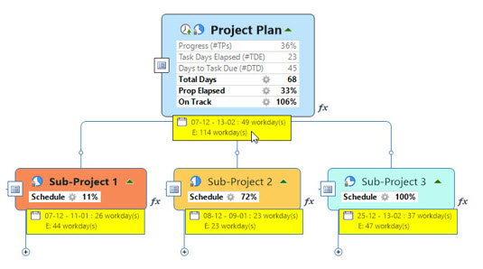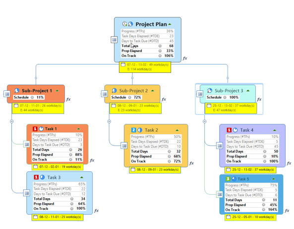 The real value of this approach emerges when the map is collapsed to the main topic/sub-project level. It becomes clear for example that Sub-Project 1 has at least one project that is very behind schedule, and Sub-Project 2 has a task that is not so severely behind schedule, even if you can’t see the sub-topics themselves: