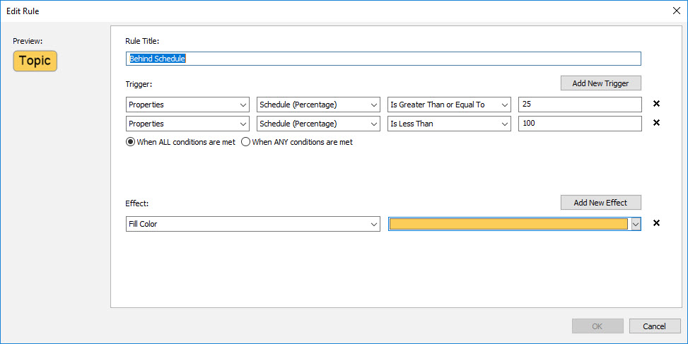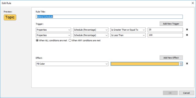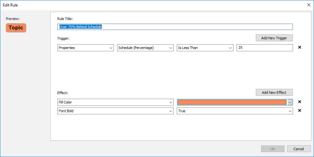 I’ve then added two conditional formatting rules applied specifically to the calculated Schedule topic property, as shown below. These use similar formatting as for the tasks themselves to show if the furthest-behind task is only 25% on track or less (ie, if the most-behind task is more than 75% behind schedule) and those that are behind but up to 25% on track. You can of course use different criteria and apply different effects: