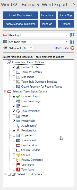 Third-party export: YES. The Olympic Limited add-in WordX2 provides a powerful and more flexible alternative to MM’s inbuilt export facility. Like the MM Word export WordX2 utilises a user-selectable Word template and styles. However, it applies the Word styles directly so avoids the editing issues of MM’s own export. Another advantage is that topic levels and even individual topics can be included or excluded, and different styles can be applied to topics at the same level.