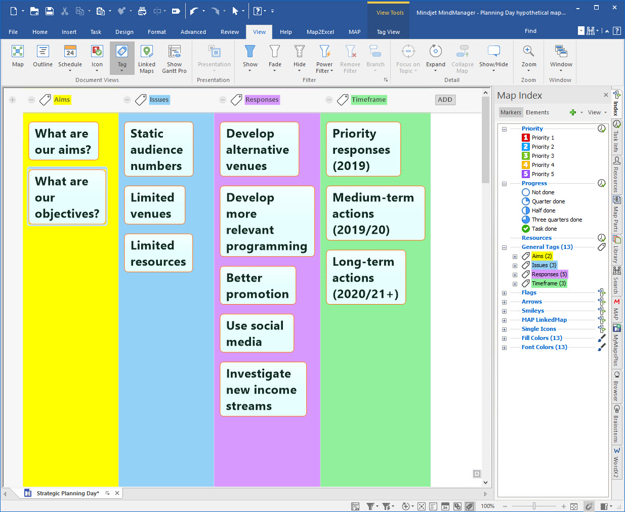In the first post in this series on the new features in MindManager 2019 I discussed the Corel’s increasing emphasis on the graphical and visualisation elements in MindManager (MM), starting with the additional conditional formatting options in the revamped SmartRules feature. Another example is the addition in MM 2019 of two new ways of viewing maps, Tag View and Icon View.