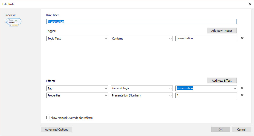 These rules each have two effects – one adds a tag for each word and the other adds the number 1 to the matching topic property. The formulas on the Central Topic sum these topic properties.